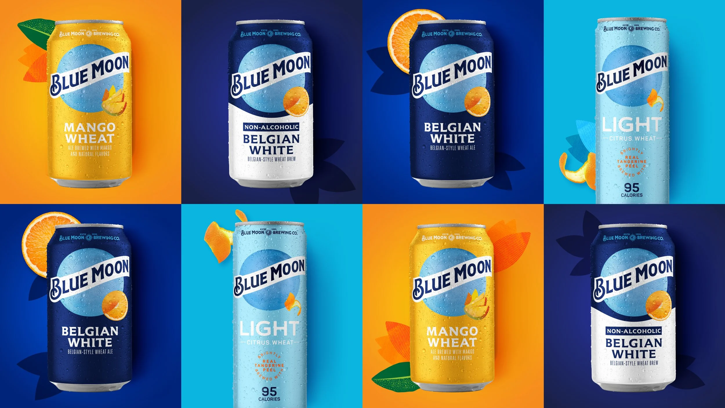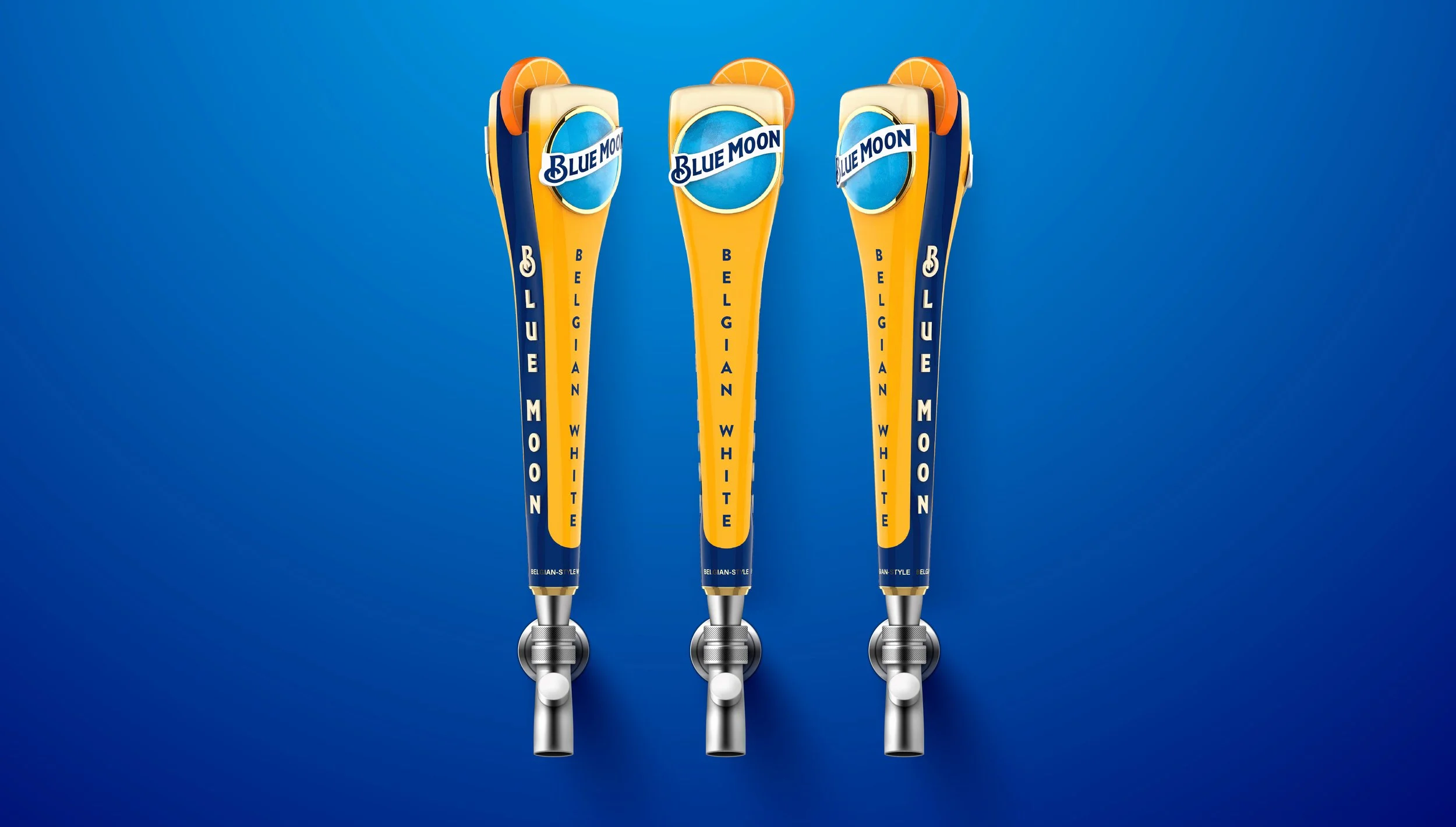 The established system creates a beacon of brightness emanating from the brand moon and brings in an imaginative creativity with the transformation of fruit throughout the design. Each flavor uses their own iconic glassware to build on the Belgian White equity into a ownable treatment across the brand. The crafted details from the badges, flavor names, typography, and Blue Moon Brewing Co. balance with the moon logo and bright color system.
